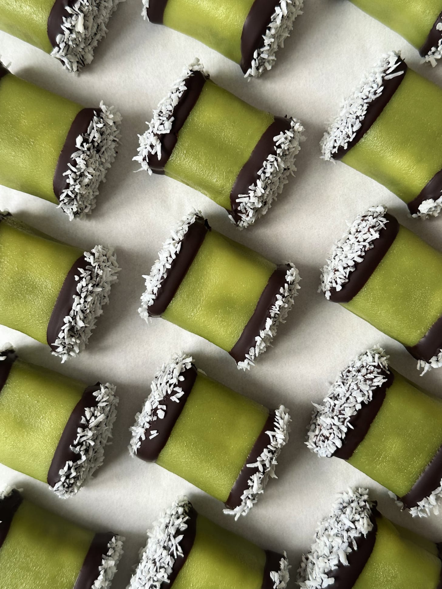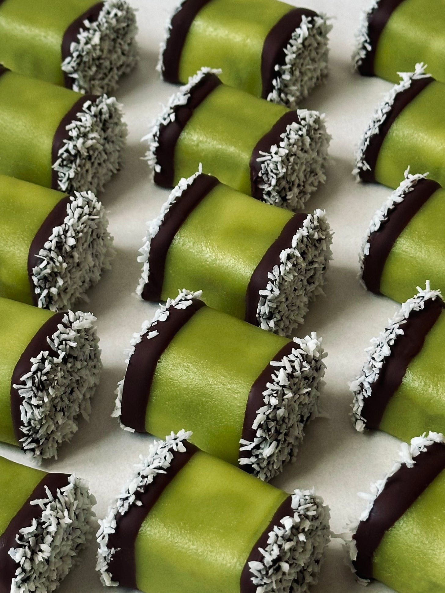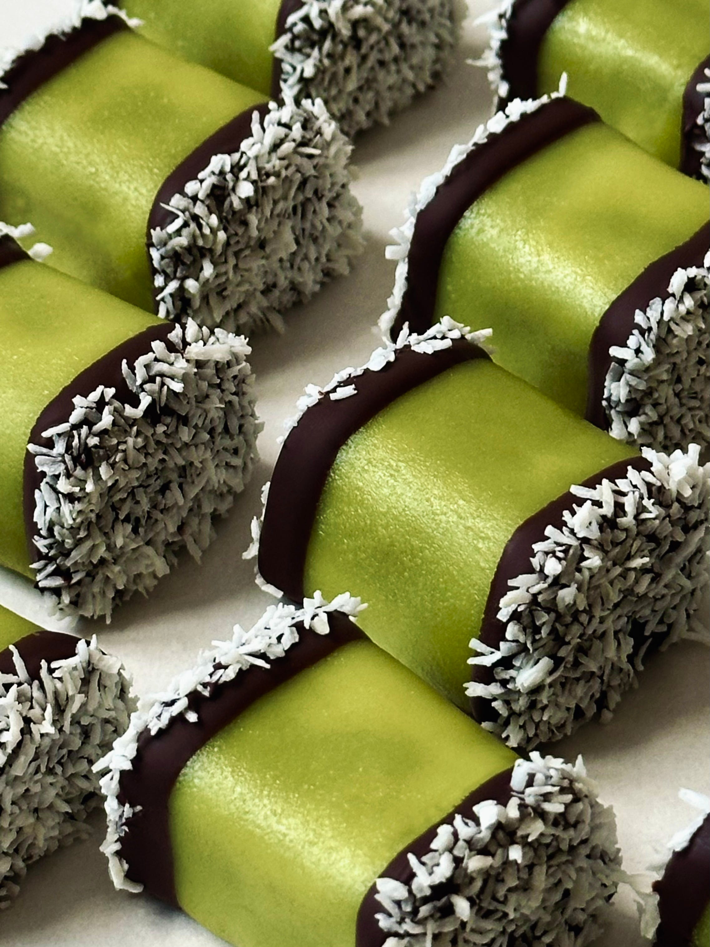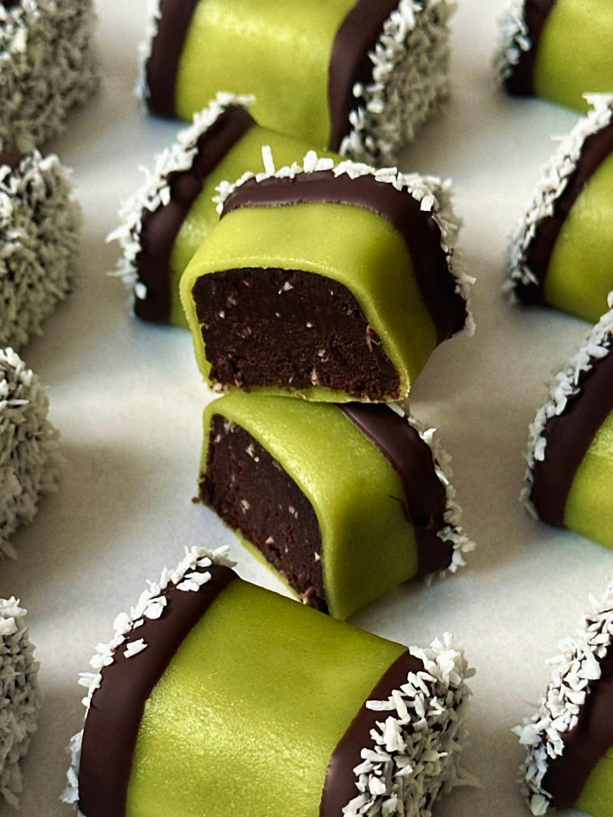 These aren’t a Christmas-time treat, rather they’re available all year round, but they always seemed beautifully festive to me, dressed in their little green marzipan coats. ‘Dammsugare’ literally translates to vacuum cleaner, reason being that these are often made from leftover pieces of cake when making another Swedish treat of Kärleksmums, a delicious chocolate, coffee and coconut cake—I instead opted to make an entire chocolate sponge specifically to make these. ‘Punsch’ is a popular liqueur in Sweden and is mixed into the cake crumbs before shaping into logs. I opted to use coffee liquor and rum instead, in addition to the strong coffee that is also used in the sponge.
