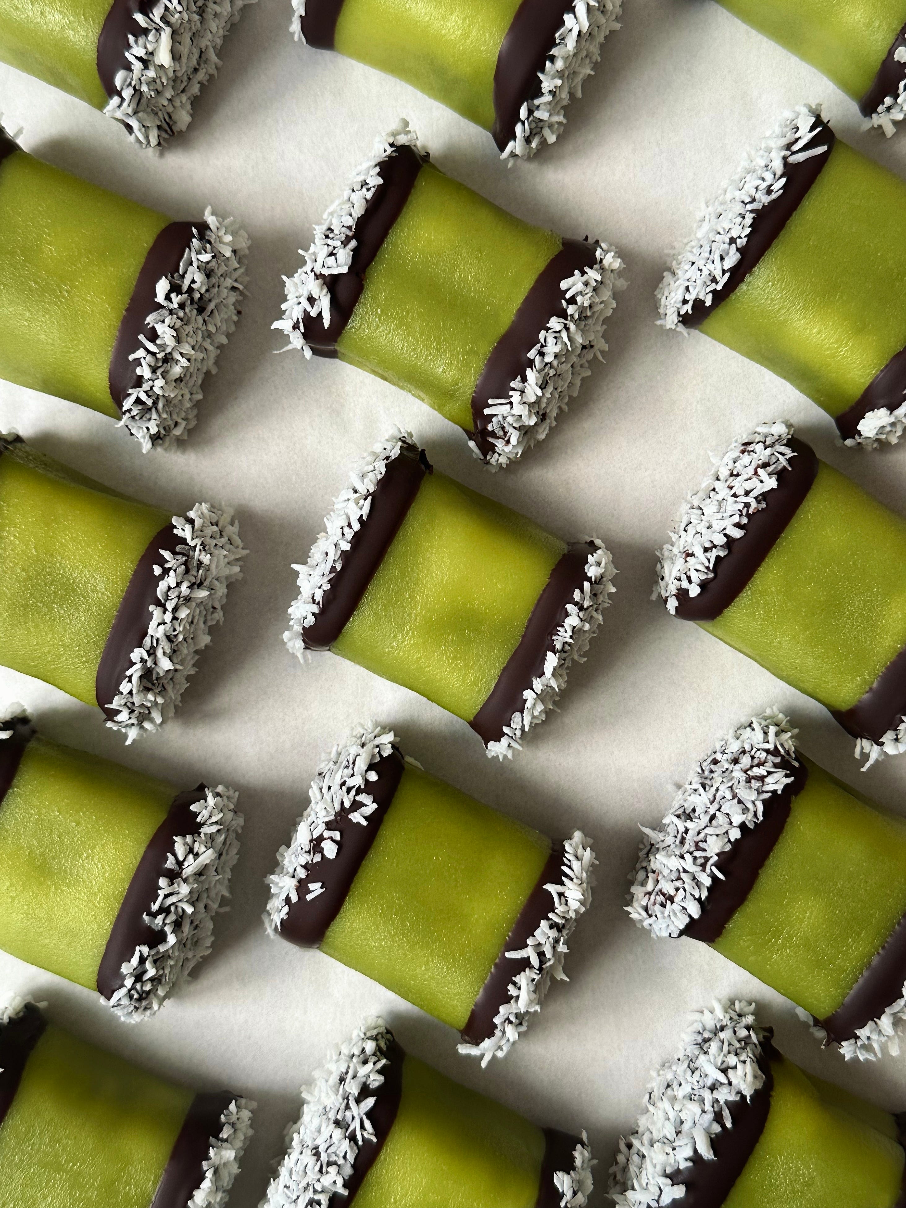 Also known as ‘punschrulle’ or ‘punsch-roll’, these are Swedish treats of chocolate cake truffle wrapped in marzipan, dipped in chocolate and sometimes sprinkled with coconut. I hadn’t seem there prior to moving to Sweden, where it now feels like I see them everywhere; from freshly made ones in bakeries, to pre-packaged ones in supermarkets and tiny little ones wrapped individually at pick’n’bix stands.